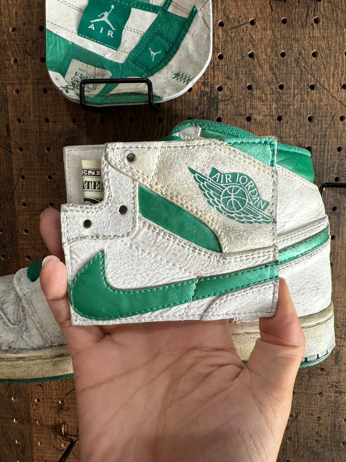 スニーカーリブート商品の中でもスニーカーのデザインを1番生かせるアイテムとなっていまして、ナイキ ジョーダン1のハイカットで作製した場合、ウイングロゴ、ウィッシュ両方を使うことが可能なため、とても贅沢な逸品となります。